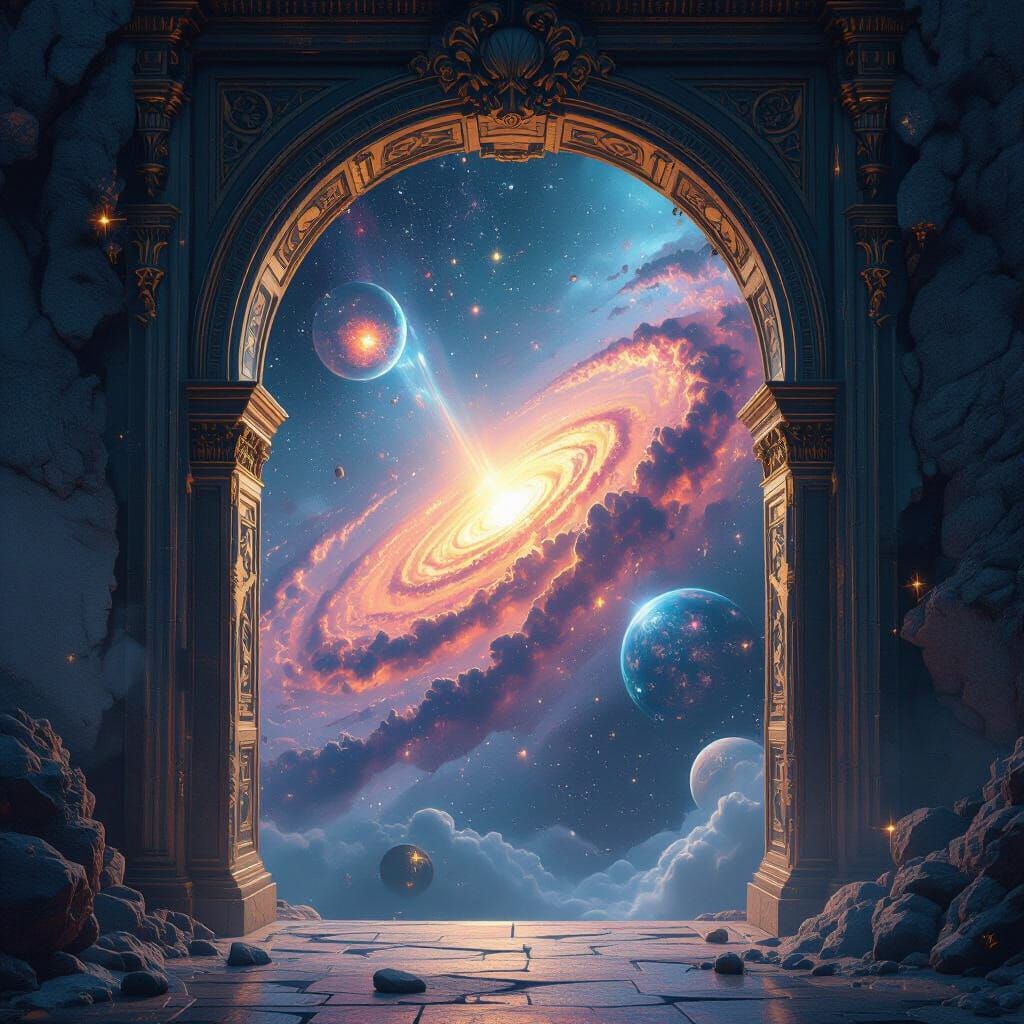 This image shows a surreal view of a nebulae-filled galaxy through an ancient doorway. Rendered as a detailed matte painting, it captures the awe-inspiring grandeur of the universe.