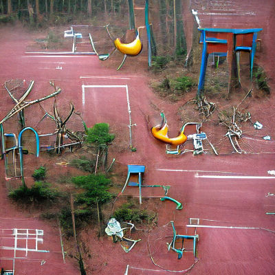 This image depicts a playground in Aokigahara forest. The scene evokes a sense of mystery and contrasts childhood innocence with the forest's somber reputation.