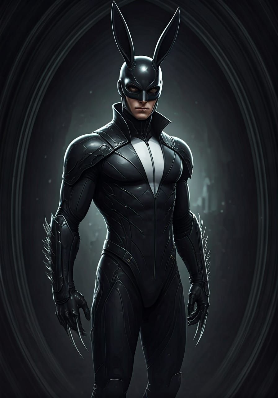 This image shows a supervillain in a rabbit-themed costume planning in their lair. The image blends futuristic and industrial elements as a digital artwork.