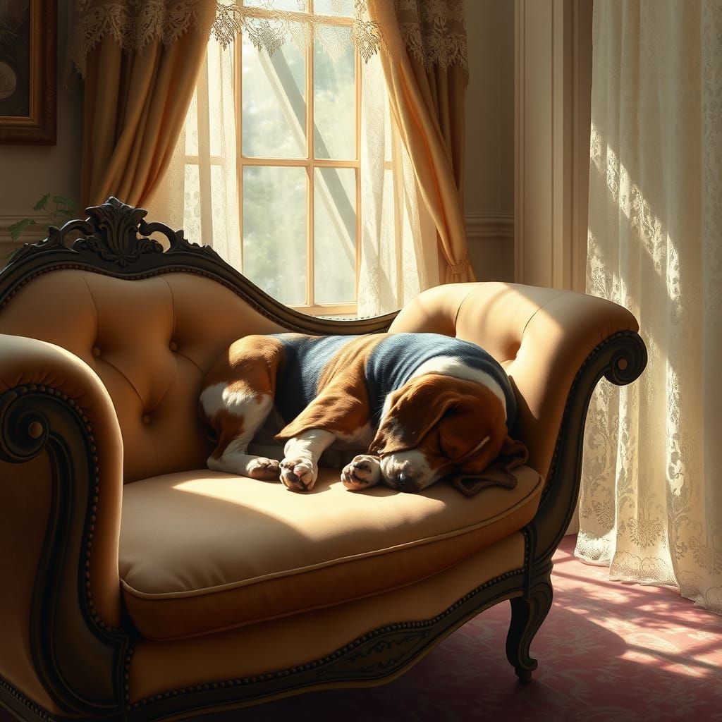This image captures a Basset Hound asleep on a plush chaise lounge in a sunlit Victorian parlor. The scene evokes a sense of peacefulness and cozy domesticity, rendered in a soft, romantic realistic style.