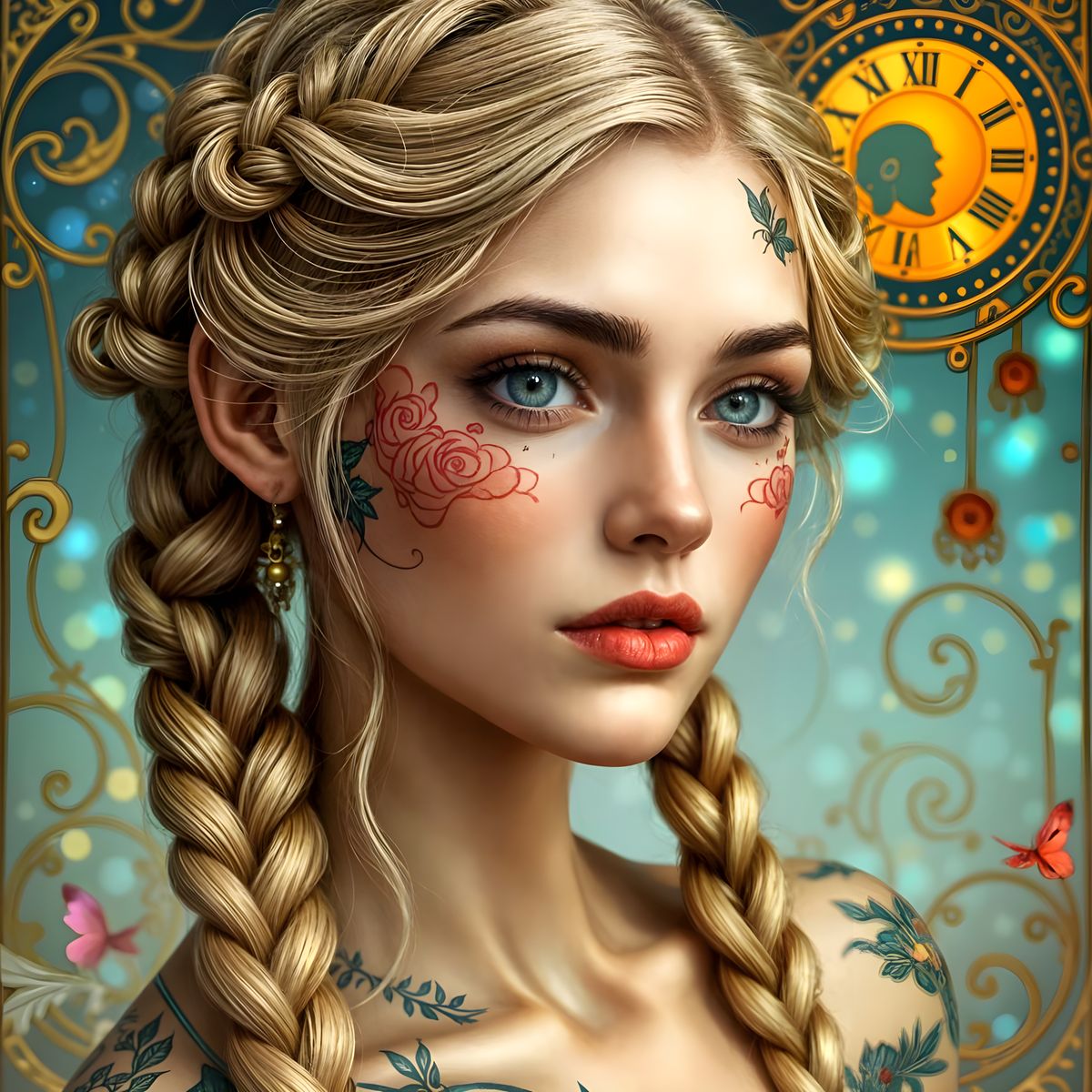 This image showcases a stunning young woman with a surreal, Art Nouveau-inspired design, featuring intricate details and a beautifully rendered, tattooed face. Blending traditional Japanese elements with a touch of science fiction, this artwork is a true masterpiece.