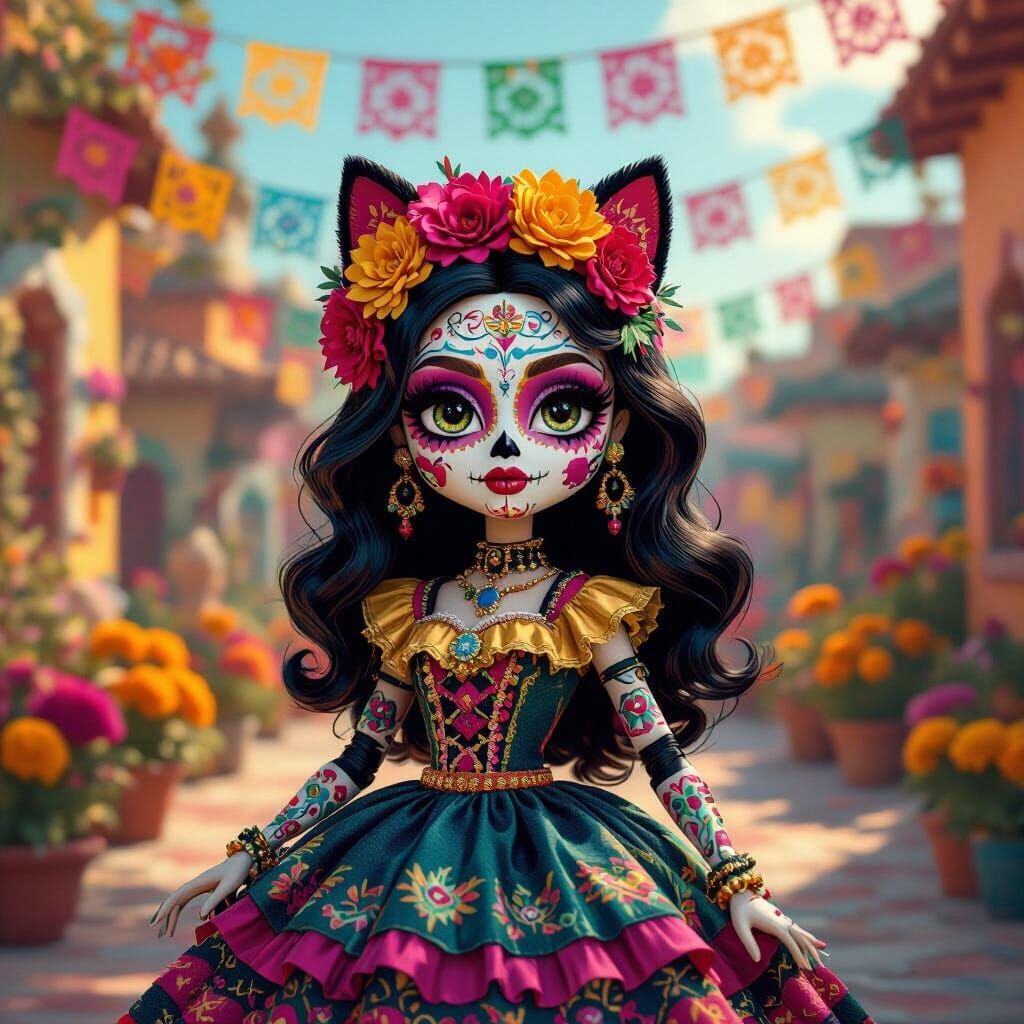 This image features a Bratz doll styled as a Catrina, with vivid makeup and festive attire, set against a colorful Día de Muertos backdrop. The scene uses bright colors and dynamic lighting for a lively, folk-art feel.