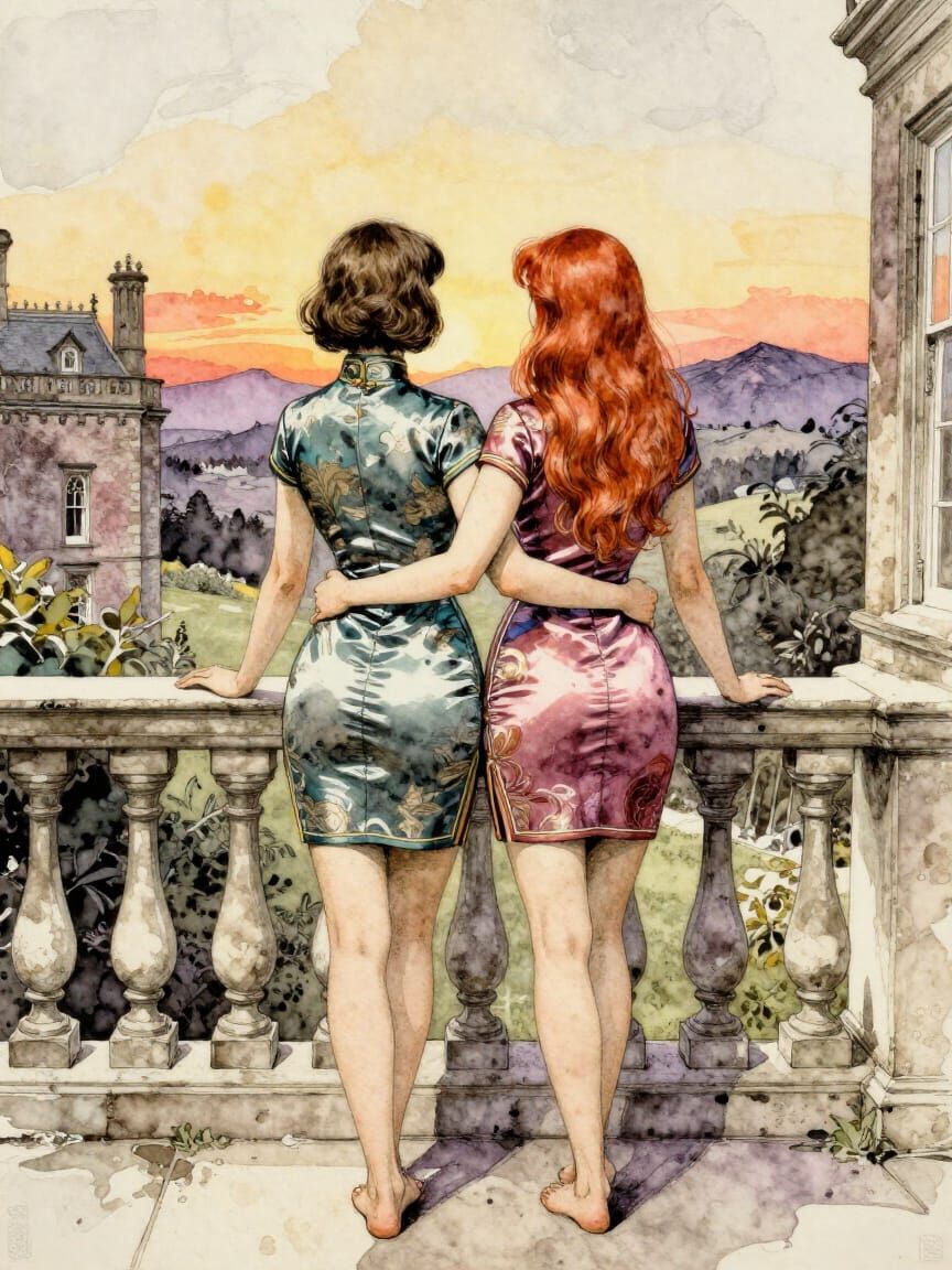 This image captures a quiet intimacy through restraint rather than display. Seen from behind, the two figures form a balanced diptych, their silhouettes echoed by the symmetry of the balustrade. The fitted dresses, with their subtle sheen and period resonance, act as visual anchors, linking the private gesture of an arm around a waist to a broader, contemplative landscape. Color plays a narrative role: the cool green and warm rose create a dialogue of difference and harmony. The absence of faces shifts the focus to posture, fabric, and proximity, allowing emotion to emerge through composition alone. I appreciate the delicacy of the framing and the way clothing and gesture quietly carry the emotional weight.