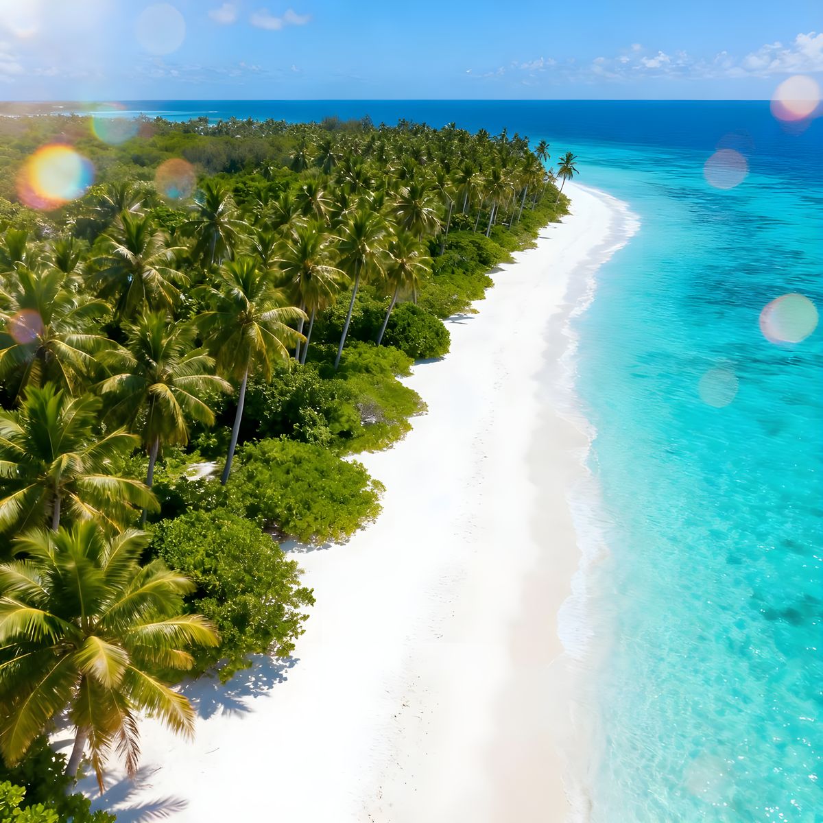 This image captures a vibrant tropical beach with clear turquoise waters, palm trees, and white sand under a sunny sky, presented in a drone photography style.