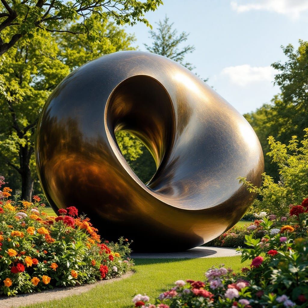 This image captures a stunning close-up of a large, abstract bronze sculpture with a smooth, organic form, set against a vibrant and colorful garden backdrop, evoking the styles of Barbara Hepworth and Henry Moore.