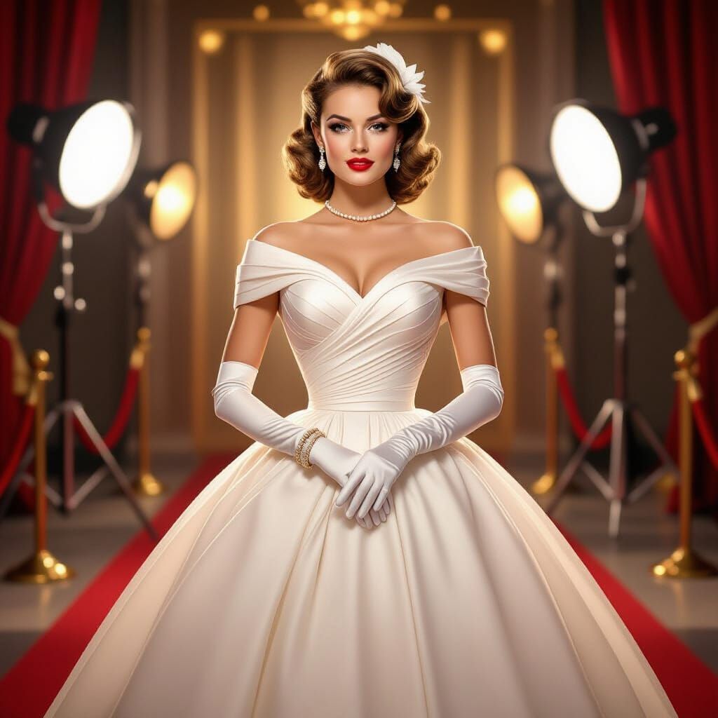 Generate your own glamorous 1950s pin-up images with elegant dresses in Hollywood settings. Free and easy AI creation.