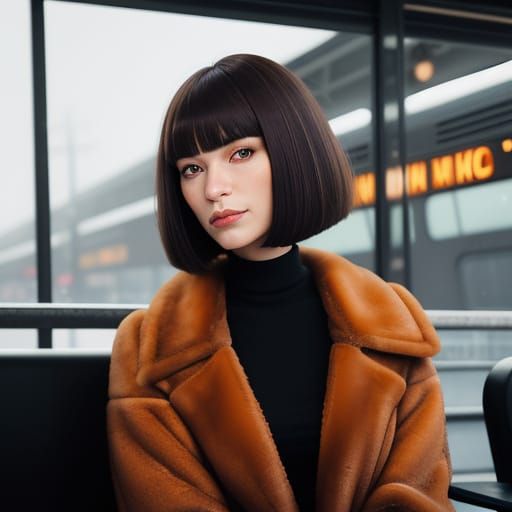 A close-up pencil drawing portrait of a woman with a bobcut hairstyle, wearing orange fur and boots, in studio lighting with bokeh. Professional LinkedIn profile image.