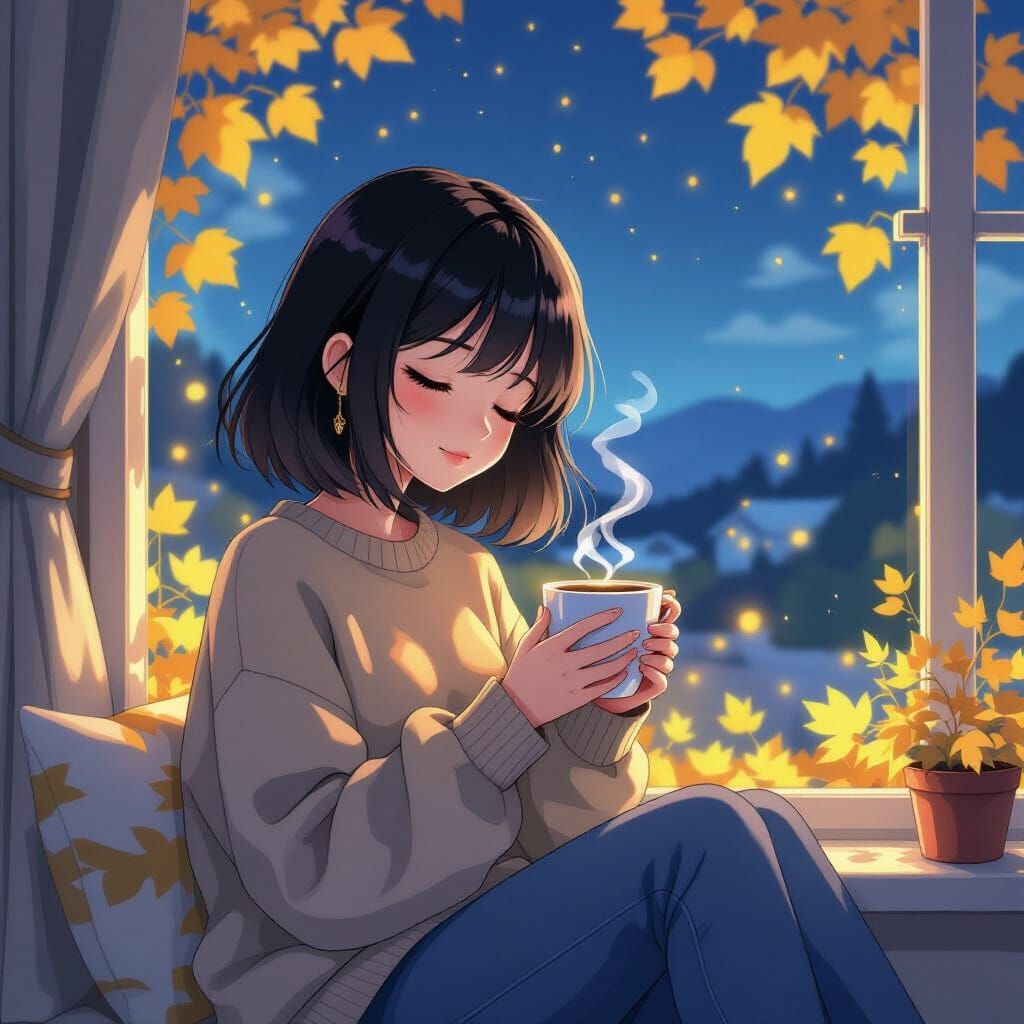 This image shows a dark-haired anime girl in a sweatshirt, asleep on a windowsill with coffee. The scene features a serene nighttime landscape with warm colors and a cel-shaded, cinematic style.