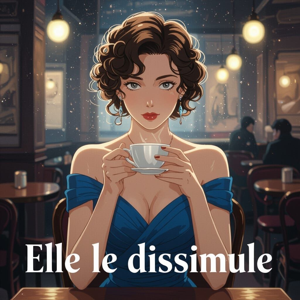 A digital painting of a woman with curly hair in a vintage cafe. The atmospheric image, reminiscent of Ghibli animation, features soft lighting and a melancholy tone.