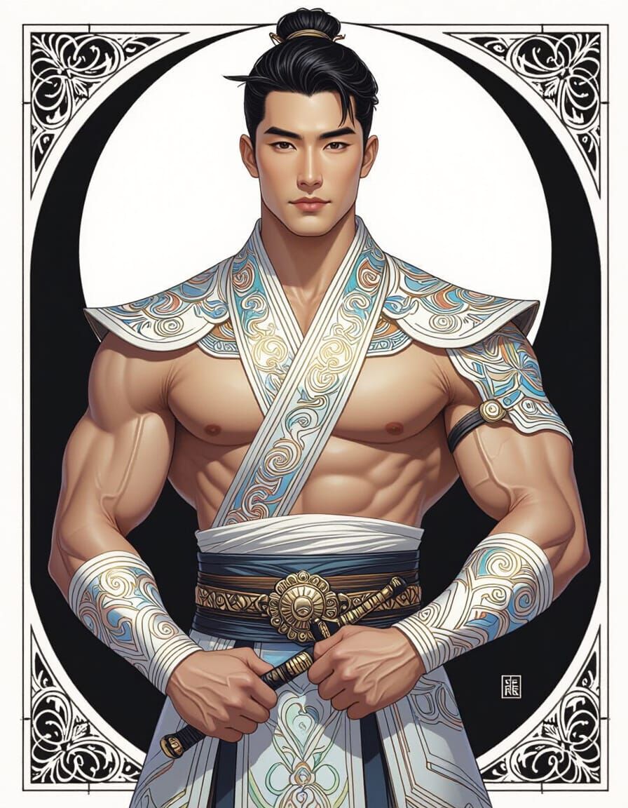 A striking picture of a muscular Asian man in traditional clothing. The artwork features subtle rainbow colors against a monochrome background, with hyperdetailed rendering and perfect anatomy, in a figurative art style.