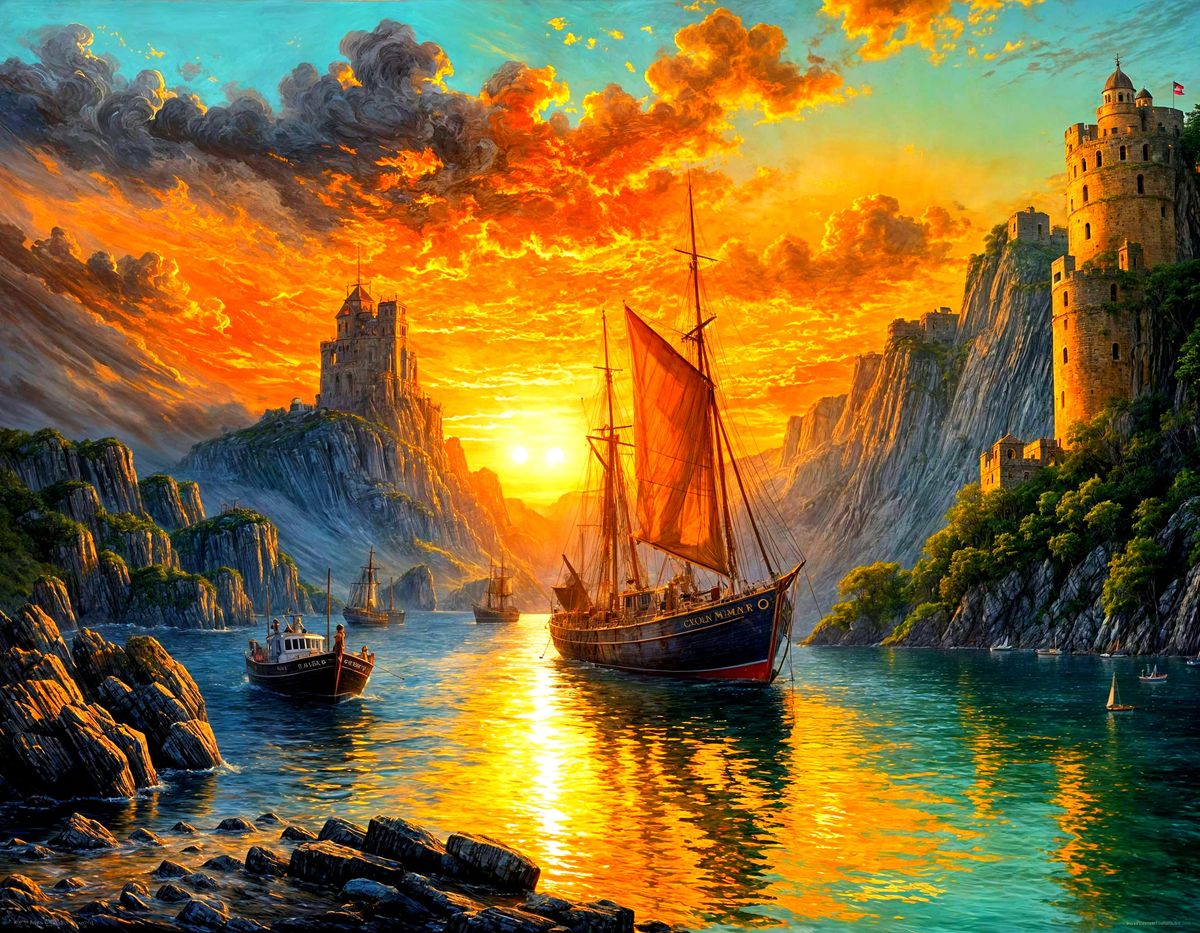 This oil painting captures three ancient wooden sailboats anchored in a tranquil bay during a vivid sunset. A fortress overlooks the scene, rendered in detailed nautical realism.