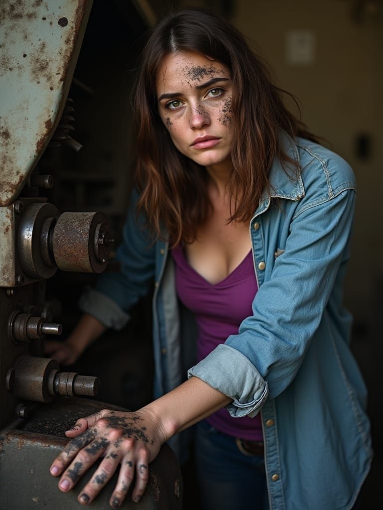 This image shows a woman with untamed brown hair and deep brown eyes, hunched over a large industrial machine, exuding fatigue and frustration, with a mix of grit and determination in her expression, set against a backdrop of complex machinery and subtle light and shadow.