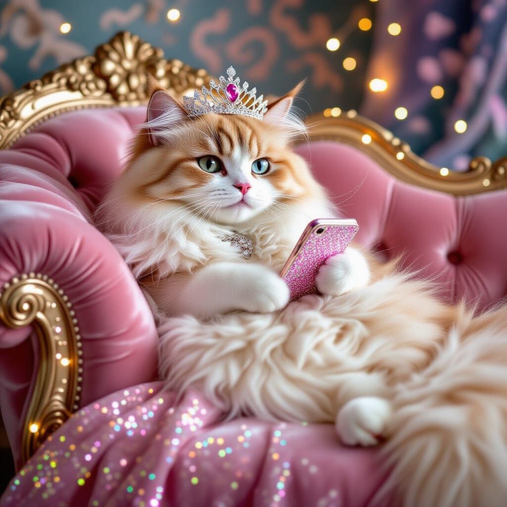 This image shows a fluffy Himalayan cat lounging regally on a chaise lounge. The cat is adorned with a tiara and holding a rhinestone-encrusted phone, all rendered with vibrant colors and a dreamy, celestial glow, in a sleek digital art style.