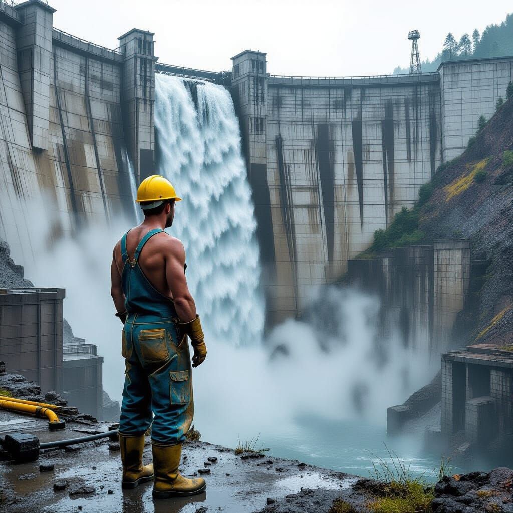 This image shows a plumber in worn overalls and a yellow hard hat standing next to a massive concrete dam with water cascading down. It's presented as gritty industrial art.