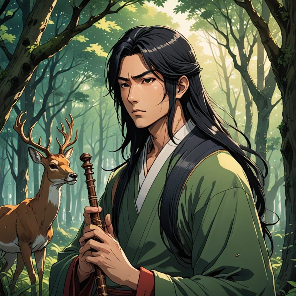 This image shows a serene 2D cartoon of a young man with black hair playing the whistle in a forest. Deer, hares, and birds gather around him, depicted in cel-shaded anime style.