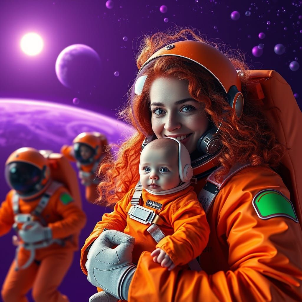 This image depicts astronauts floating in space, surrounded by vibrant purple hues and shimmering colors. They wear bright orange suits and smile through their helmet visors, amidst a backdrop of swirling clouds and distant planets.