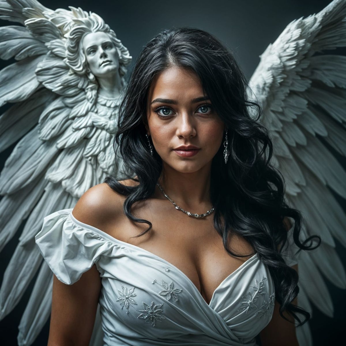 A striking picture of a gothic angel with raven hair and piercing eyes. She wears a flowing white gown and embodies eternal beauty and wisdom in a hyperrealistic style.