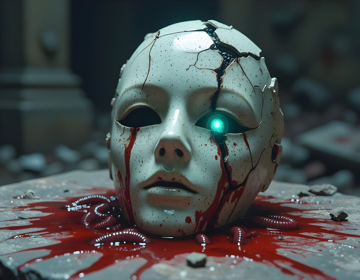 Dark fantasy. Extreme close-up shot. A decaying, porcelain mask lies shattered on a bloodstained altar, revealing a nest of writhing, bioluminescent worms. Ominous lighting, detailed, intricate, fantasy concept art, inspired by Zdzisław Beksiński and H.R. Giger. 8k resolution, trending on Artstation, a masterpiece, best quality, volumetric lighting, god rays, dynamic composition.