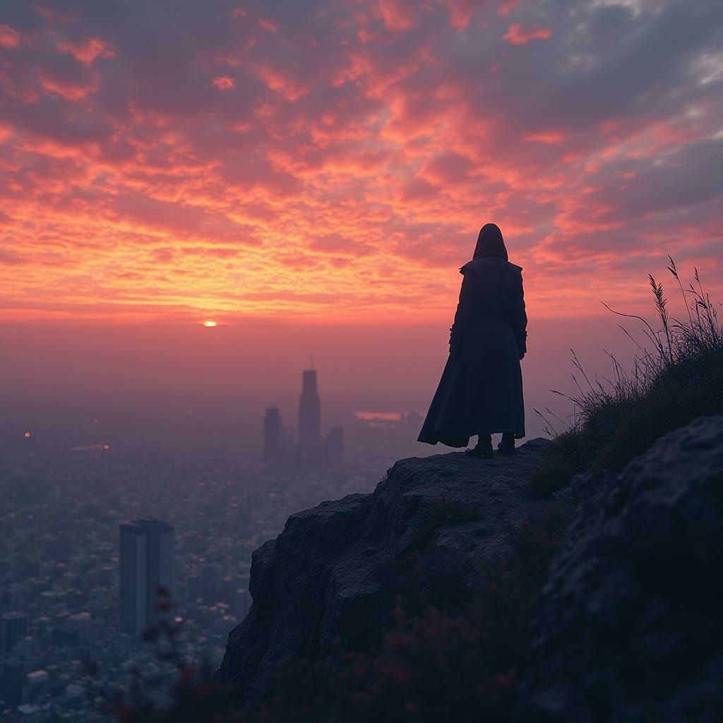 This image shows a mysterious figure standing on a windswept hill, gazing out at a sprawling city at dusk. The sky is ablaze with vibrant colors, casting long shadows across the city. The figure is silhouetted against the kaleidoscopic sky, exuding a sense of solitude and introspection.