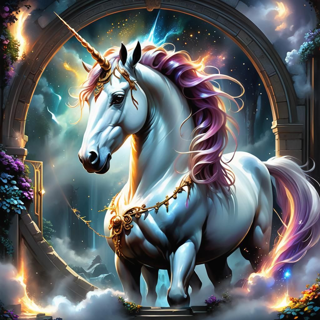 A hyperrealistic image shows a unicorn opening a portal to a magical realm. The artwork features vibrant, deep colors, sharp details, and dramatic lighting, in a fantastical digital painting style.