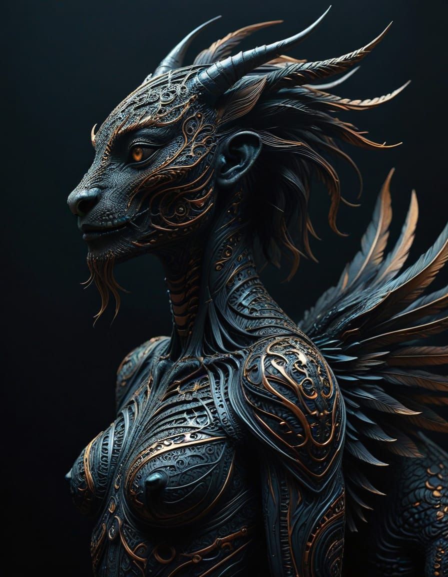 This image is a dreamlike representation of a surreal world, characterized by bold lines, intricate details, and a dark, warm color palette, created using a hyper-realistic style with chiaroscuro effects