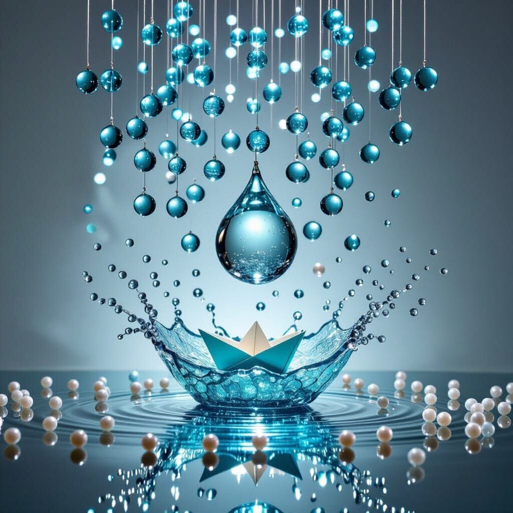 This image shows a surreal kinetic sculpture of a rainstorm frozen in time. Aqua glass beads hang as droplets above a mirrored base, with pearl beads rising as splashes in a playful yet uncanny style.