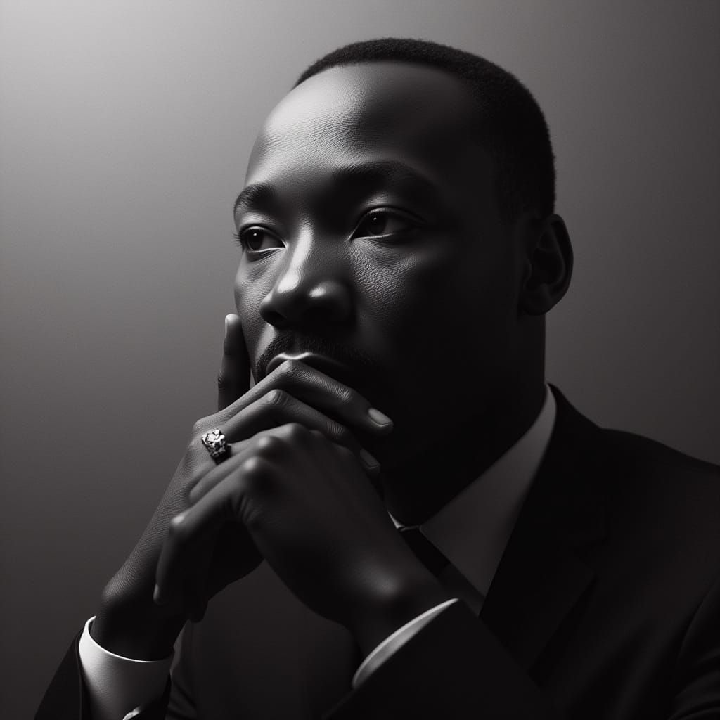 A striking monochrome portrait of Martin Luther King Jr. lost in thought. The image has deep blacks and bright whites, reminiscent of high-contrast portrait photography.
