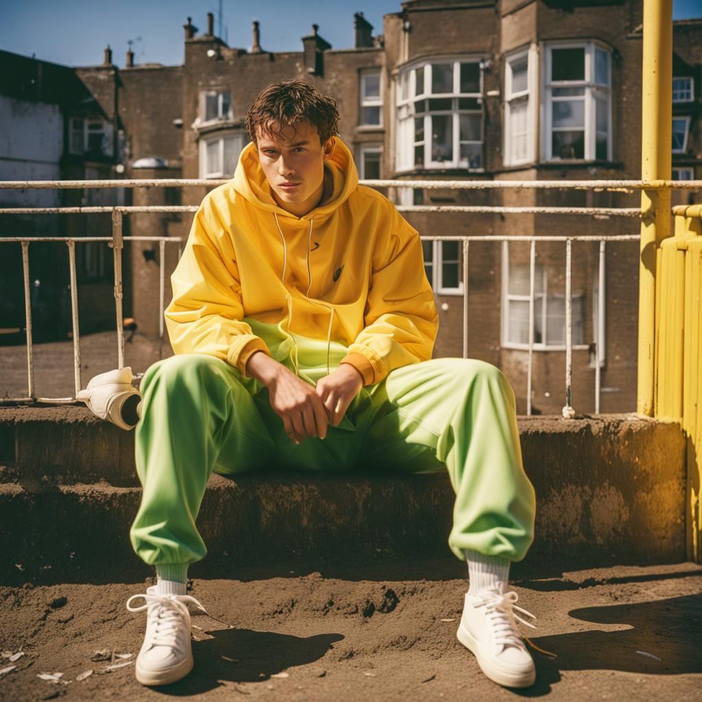 This image captures a 1970s Yorkshire council estate scene in a 90s-style flash photo, complete with a young man vaping in a Nike tracksuit and a seagull-filled sky. The image has a strong amber hue.