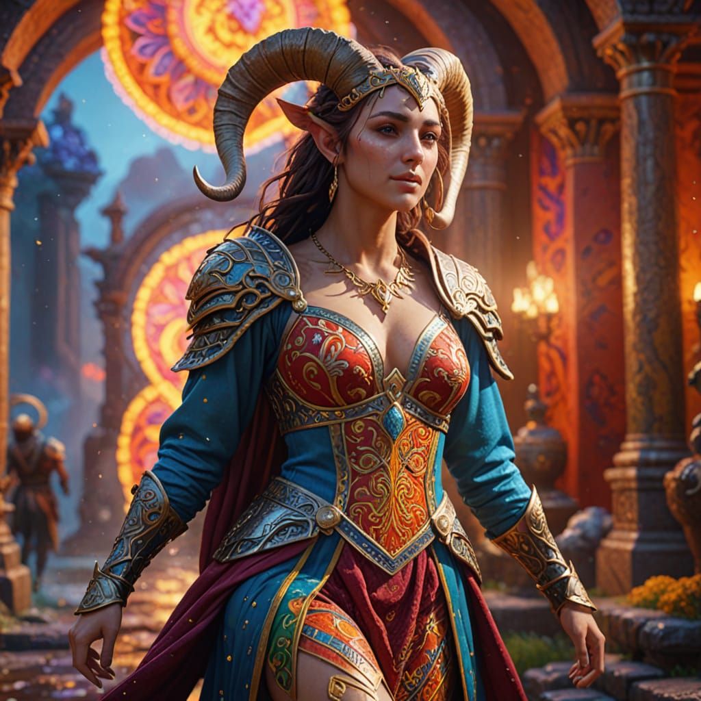 This image shows Aries sleepwalking in a vibrant fantasy setting. The digital artwork features intricate details, dynamic lighting, and a complementary color palette, rendered as epic videogame graphics.