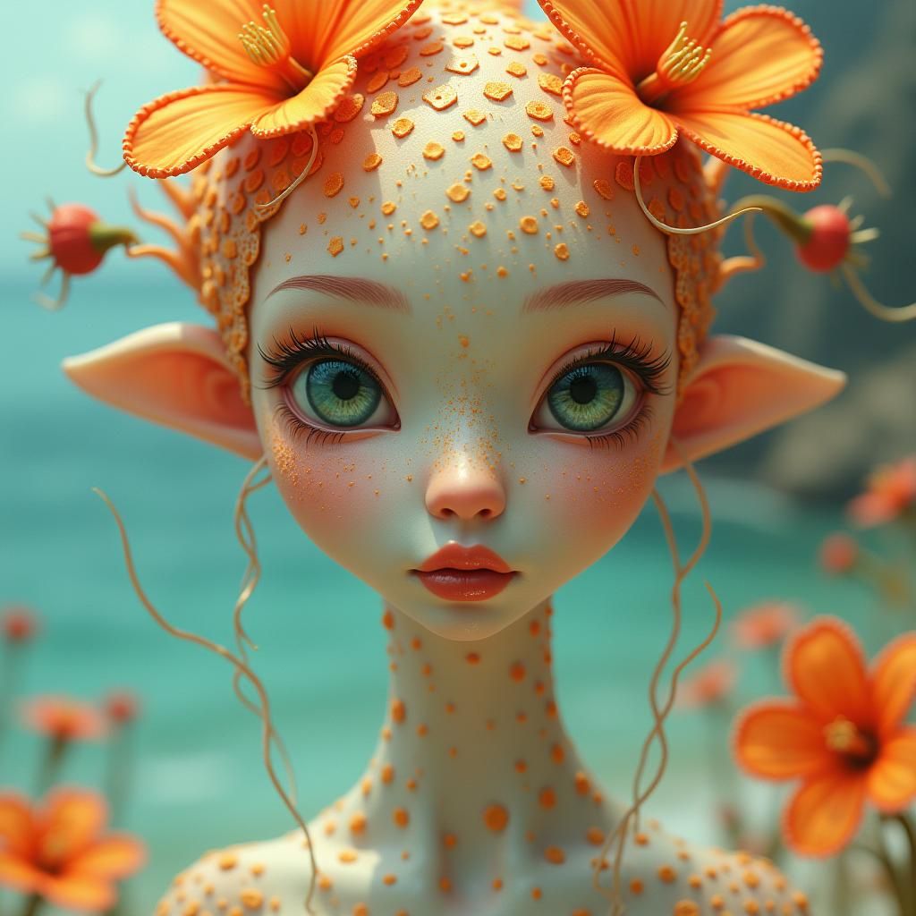 This image shows a surreal sea creature with a long neck, orange freckles, and striking makeup details. The artwork features warm colors, soft focus, and a coastal backdrop, rendered as 3D anime art.