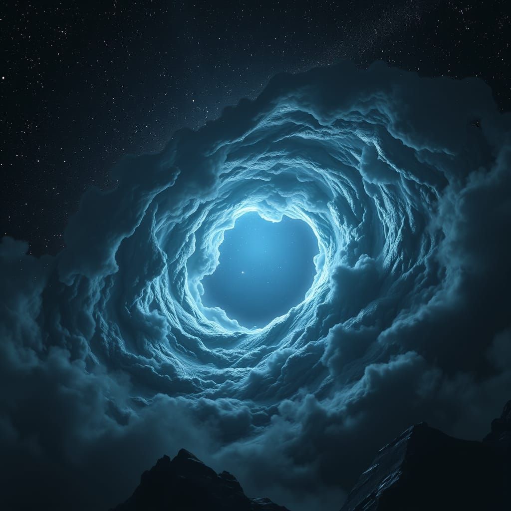 This maximalist digital matte painting showcases a swirling vortex of dark energy in a star-filled sky, featuring dramatic light and cinematic scope.