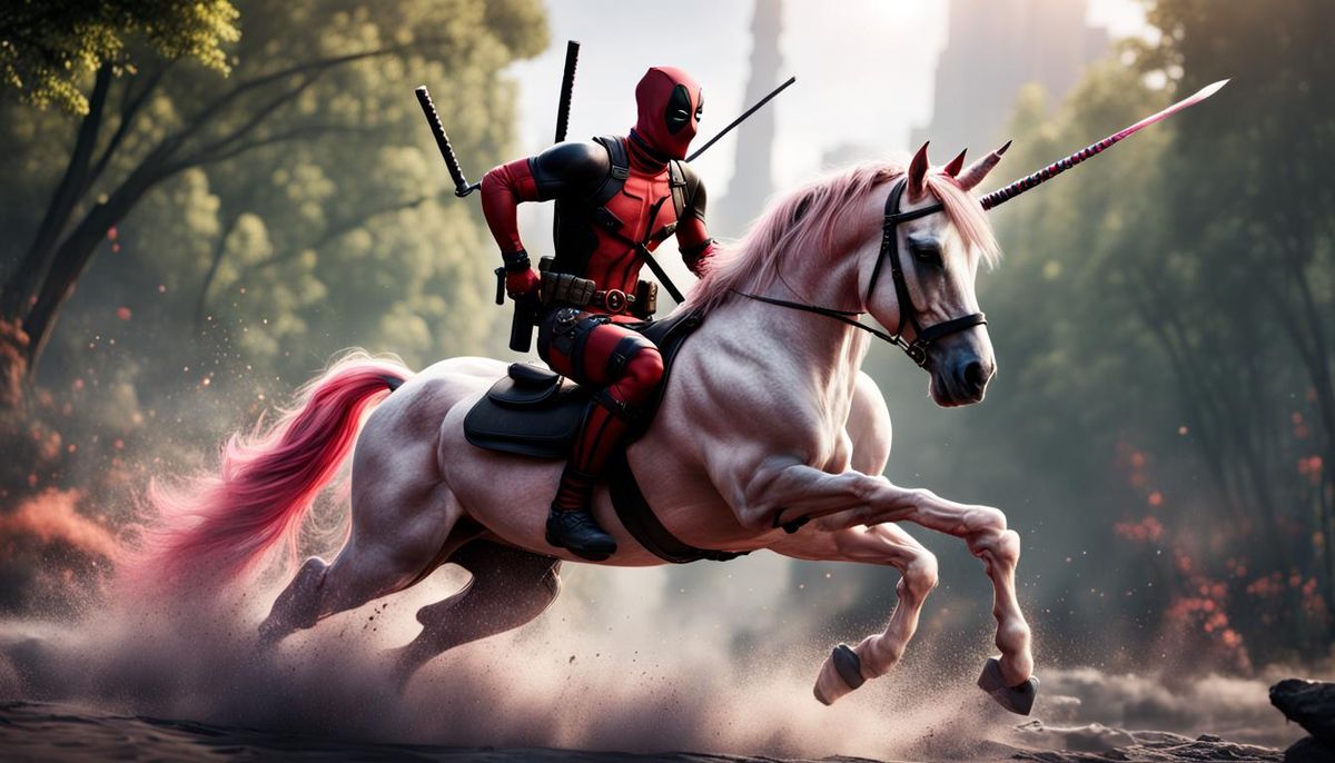 This image shows Deadpool riding a unicorn into battle. The detailed matte painting features deep colors, intricate details and complementary colors. It is a work of fantasy concept art.