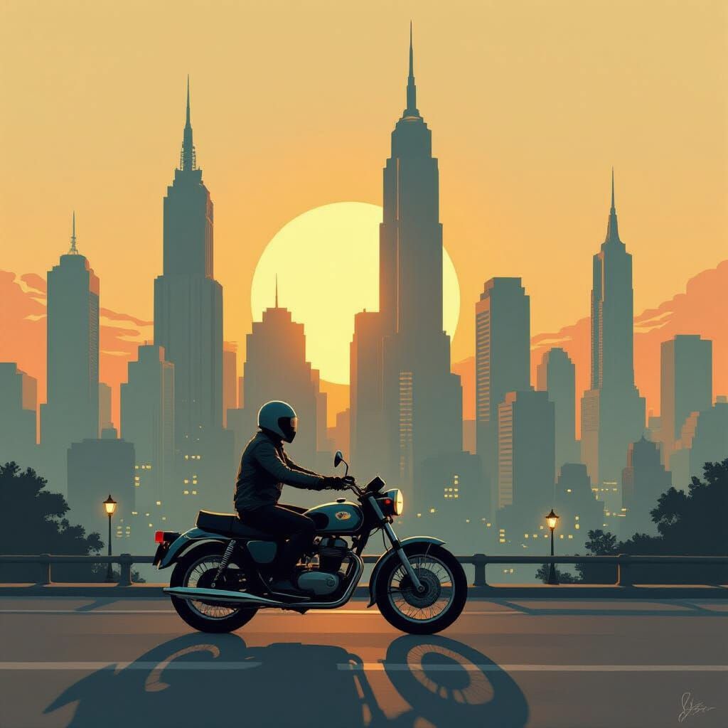 This digital illustration shows a solitary figure on a vintage motorcycle against a backdrop of towering Art Deco skyscrapers. The scene features cinematic lighting and a muted, nostalgic color palette, evoking quiet solitude.