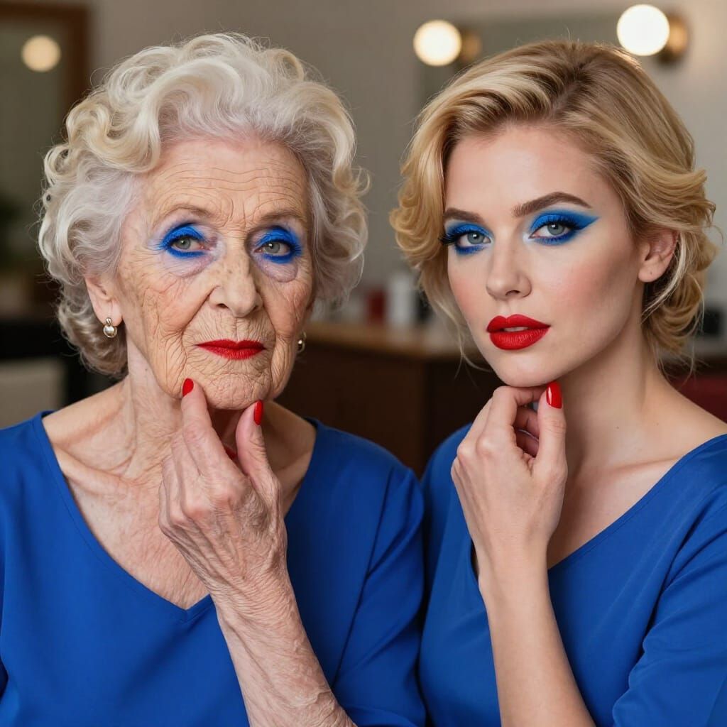 This image features an elderly woman and a young woman with matching bold makeup, red lips, blue eyeshadow, and striking outfits. Professional photography captures their look with sharp focus.