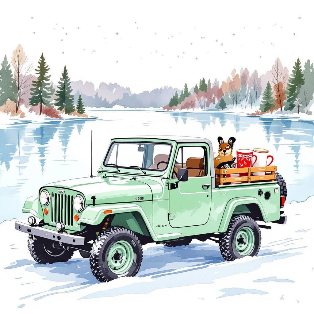 This image shows a pastel green jeep parked by a frozen lake. Ice skates and mugs are visible in the back, depicted in a watercolor style with bright, glossy colors and a whimsical aesthetic.