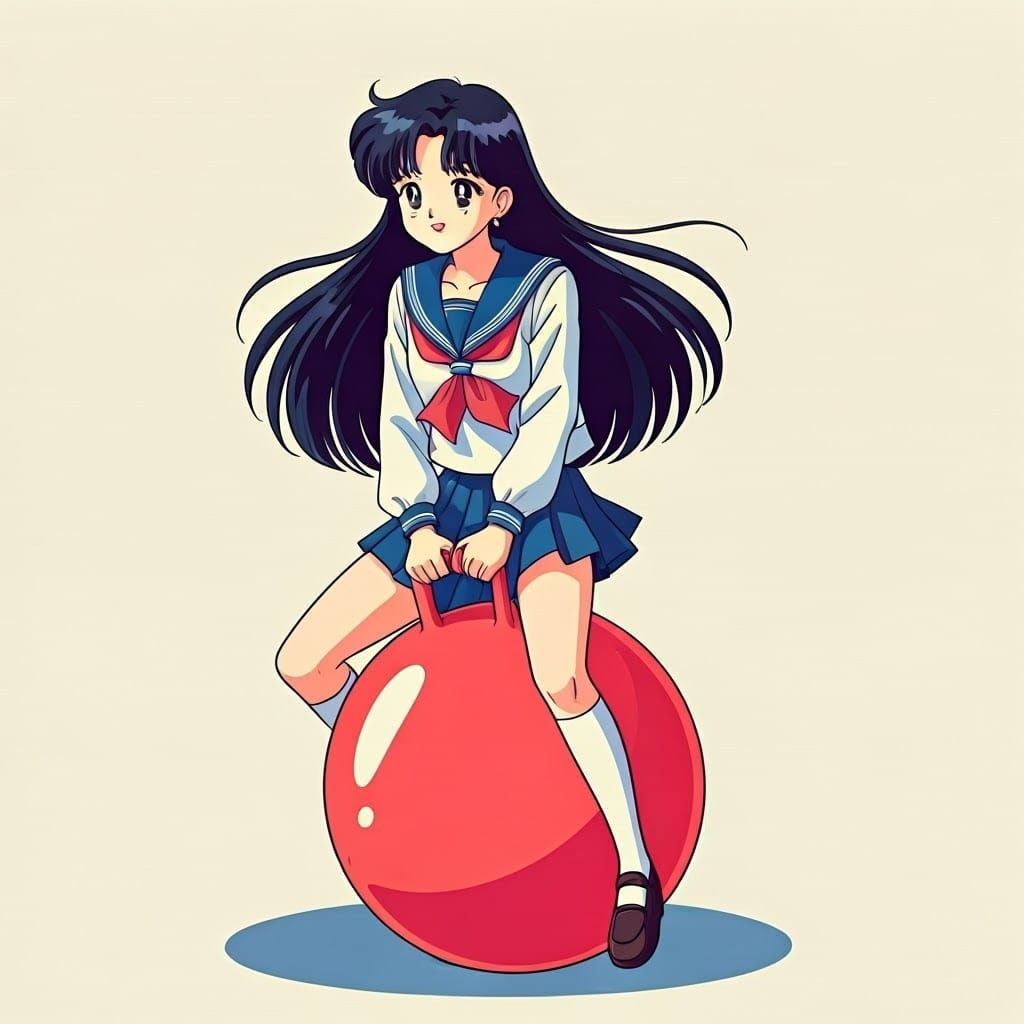 This vibrant image captures a magical girl in her school uniform, bouncing on a red hopper ball amidst a kaleidoscope of pastel colors and dynamic lines, reminiscent of classic manga and the iconic style of Sailor Moon