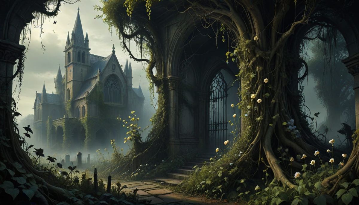 A gothic garden scene with a crumbling wall overtaken by vines and strange flowers. The image evokes a sense of sinister horror and is rendered with detailed textures.