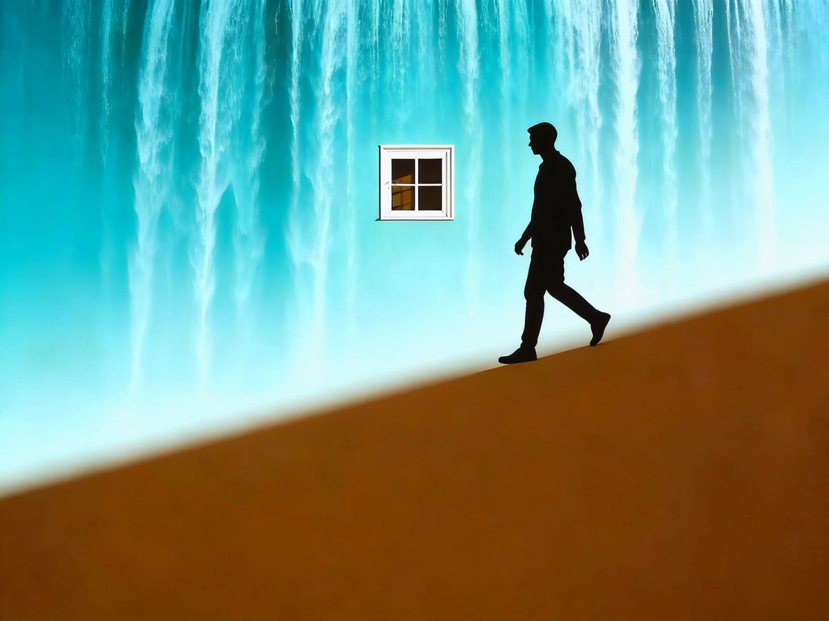 This fine art photograph features a minimalist scene with a person's silhouette and shadow cast on a golden yellow wall. A small, white-framed window is visible above.