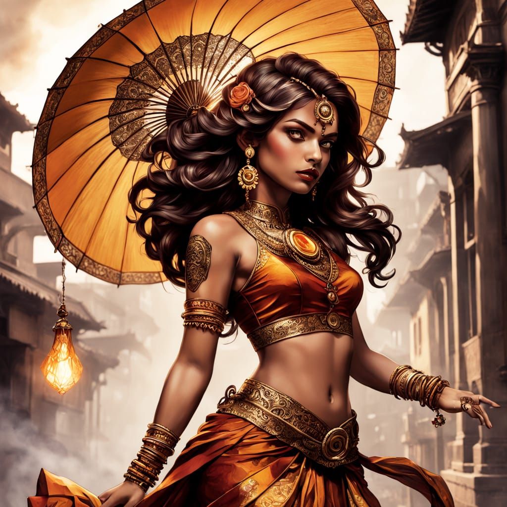 This image depicts a stunning Indian-inspired heroine with a deep, rich complexion and bold, vibrant colors reminiscent of pulp comic art. Her long, dark hair is adorned with copper wire and jasmine blossoms, while her eyes burn with an inner fire. She wears a sari-inspired skirt and gold accessories, wi...