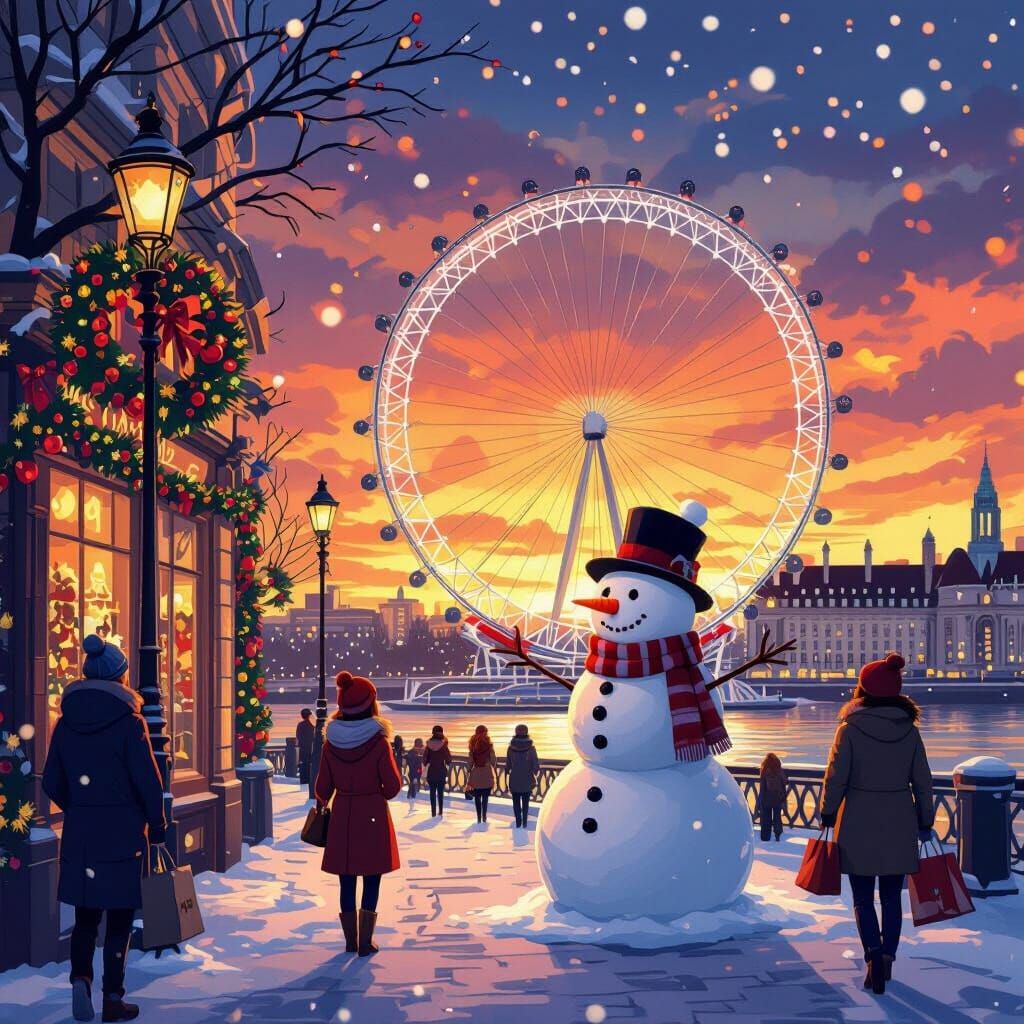 This image shows a snowman near the London Eye during a sunset. The scene includes festive holiday decorations, gentle snowfall, and people with shopping bags in a cel-shaded manga style.