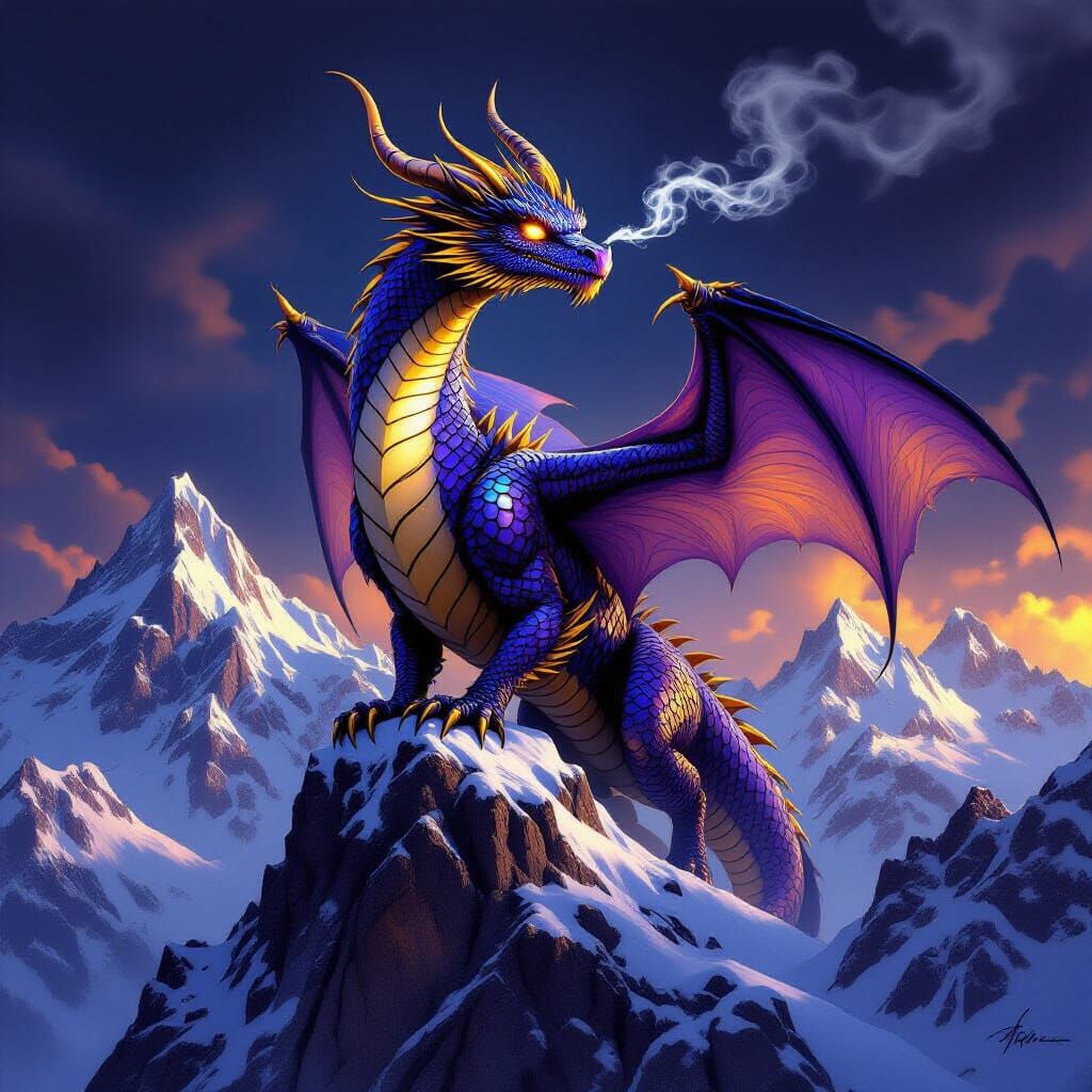 A magnificent dragon with iridescent scales rests on jagged, snow-capped mountains. Its eyes glow, and smoke drifts from its nostrils, set against dramatic lighting in a vivid fantasy art style.