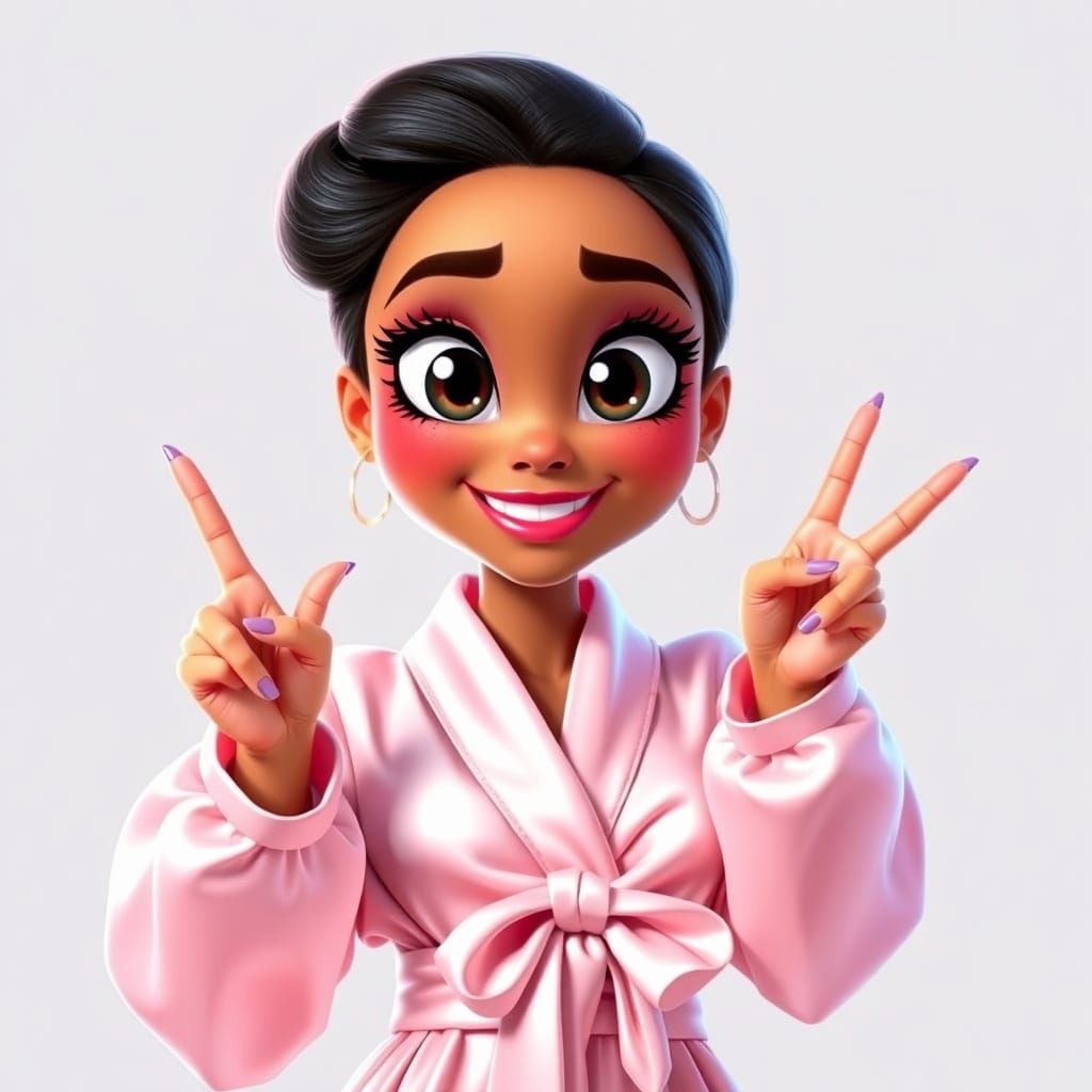 This image features a stylized young woman with light brown skin and bold makeup, showcasing her expressive features and playful personality. She wears a pale pink satin robe and flashes peace signs, exuding a carefree, youthful energy in a whimsical, dreamlike world.