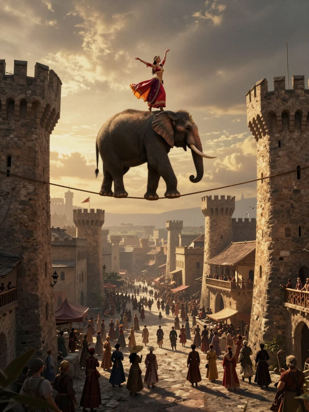 This image depicts an elephant balancing on a tightrope between medieval towers, with a performer on its head. Rendered in a detailed, realistic fantasy concept art style with atmospheric lighting.