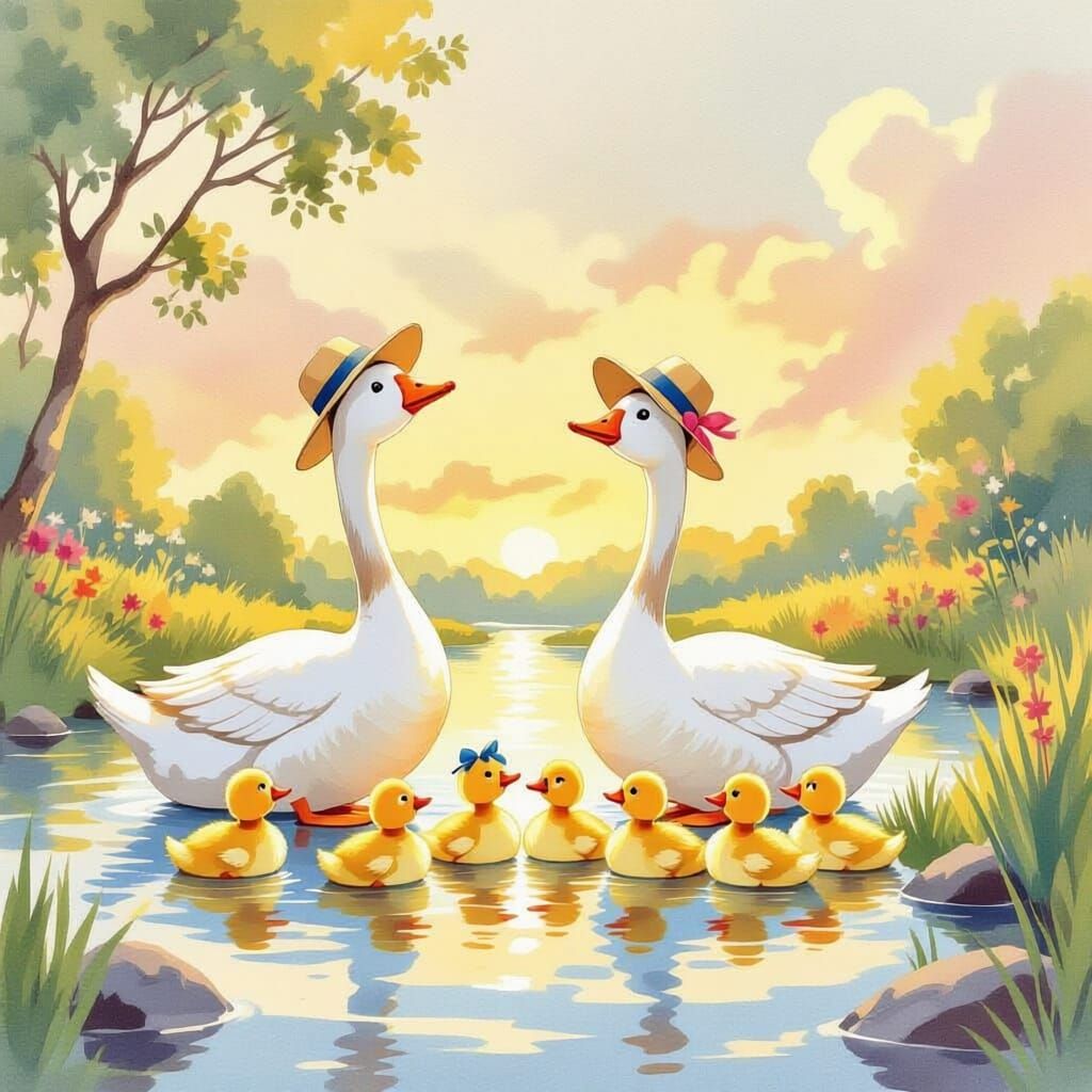 This charming watercolor illustration features a mother and father goose with ten unique goslings, each adorned with a hat or ribbon, gazing skyward. Ideal for a children's book cover.