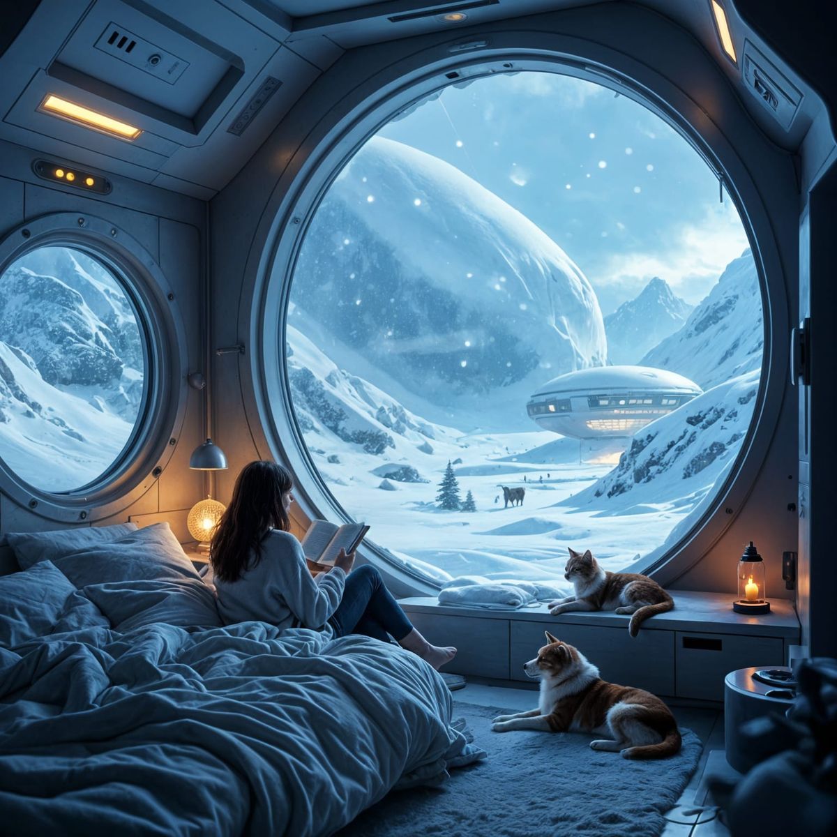 This image shows a warm, cozy bedroom in an alien colony during a fierce blizzard. Soft interior light contrasts with the icy exterior, creating a tranquil atmosphere.