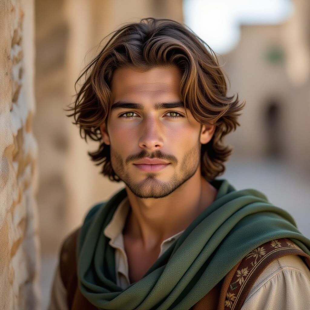 This hyperrealistic image features a young man with sun-kissed skin, wavy brown hair, and striking heterochromatic eyes. He wears earth-toned clothing under a radiant halo, set against a serene twilight landscape.