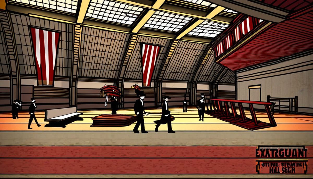 This image depicts an opulent steampunk-inspired hall, meticulously detailed with Victorian-era aesthetics. Explore a world of intricate machinery and grand architecture.