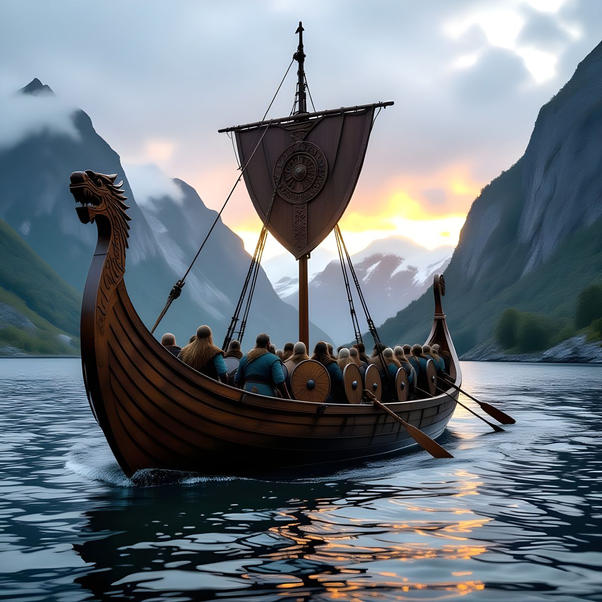 This image shows a Viking longship sailing through a fjord at sunset. The ship is full of warriors and features intricate carvings. The surrounding landscape is rugged, creating a dramatic, historical scene with muted colors.