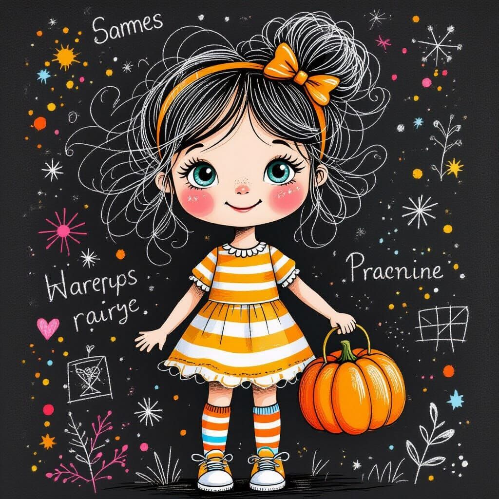 This image is a whimsical chalk art illustration of a girl with short, doodle-style hair and hazel eyes, smiling softly while holding a pumpkin. It features watercolor splashes and ink splatters for a vibrant, painterly effect.