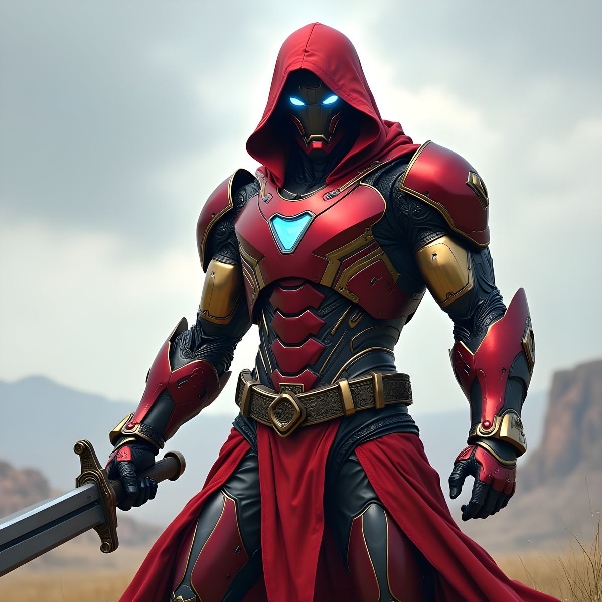 A striking picture of a male figure in elaborate Iron Man-inspired armor. The design features a cyberpunk aesthetic, with red and gold panels, sharp lines, and a ninja hood, set against a dramatic sky.